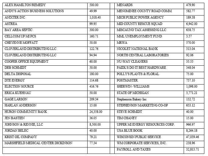 Mayor John Starzynski called the regular meeting of the Stephenson City Council to order at 6:00 PM. Present were Council members Dale Parrett, David Solander, Ronald Zahorik, Howard Fredrickson, Martha Haight, and Brian White. Also present were Jordan Belec, DPW Supervisor, Leon Felch, City Assessor, and Karma Tessmer, City Clerk.