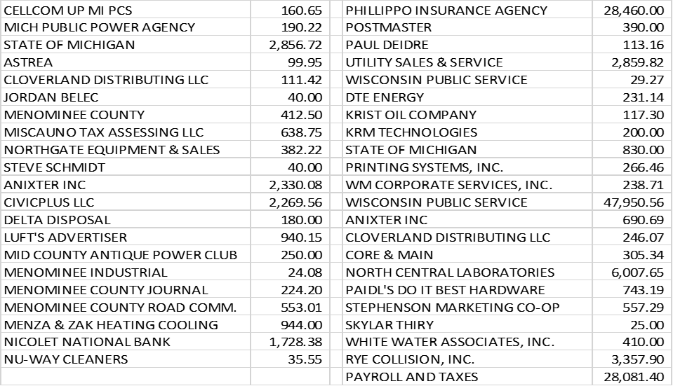 Deputy Aaron Ihander provided the Menominee County Sheriff’s Report. He left Council chambers at 6:05 PM.